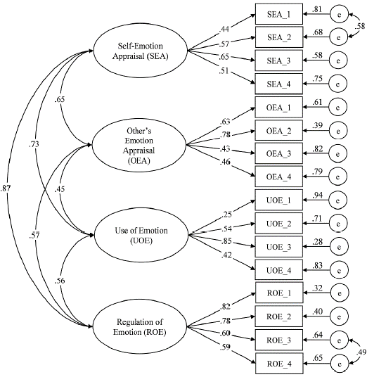 In terms of the CFA, the first model was designed based on Wong & Law's (2002) theoretical formulation, four factors with four items each, Self-emotion appraisal (SEA_1 to SEA_4), Other's emotion appraisal (OEA_1 to OEA_4), Use of emotional (USE_1 to USE_4), and Regulation of emotion (ROE_1 to ROE_4). Model 2 was constructed based on model 1, for which the correlation between the errors from items SEA_1 and SEA_2 was added. Model 3 was built based on model 2 and the correlation between the errors from items OEA_3 and OEA_4 was added. This model showed the best fit indices (Table 2). Additionally, Figure 1 presents the standardized coefficients for Model 3 and their standard errors.