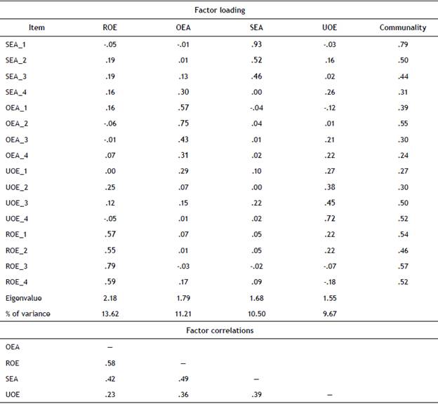 For the EFA, the index of sampling adequacy was middling (KMO = .76). The Bartlett's Sphericity Test showed that the correlation matrix was adequate for the factor analysis, x2(120) = 583.67, p < .001. Horn's parallel analysis and the Kaiser-Gutman rule suggests four factors, and the scree test indicates extracting one factor. An EFA (four factors) was executed for which all items have factor loadings greater than .30, except item (UOE_1). The structure found was similar to that reported by Wong & Law (2002); however, there were differences in the items SEA_4 and UOW_1 (Table 1).