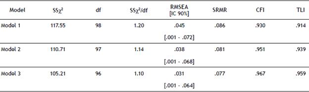 CFA was used through the Weighted Least Squares Means and Variance adjusted (WLSMV) estimation method with robust standard errors and a SS (Scaling-Shifted) scaled statistical test. In order to assess the fit of the model, we considered several indexes: the ratio between adjusted chi-square and degrees of freedom (SS%2/df ), less-than-two was seen as an adequate value; Comparative Fit Index (CFI), superior to .95 was considered as good (Keith, 2019); Tucker-Lewis Index (TLI), above .95 indicated a good fit (Keith, 2019; Schumacker & Lomax, 2016); Root Mean Square Error of Approximation (RMSEA), with values below .06 being indicative of a good fit model (Hu & Bentler, 1999); Standardized Root Mean Square Residual (SRMR), values lees than .08 suggest a good fit model (Hu & Bentler, 1999; Keith, 2019).