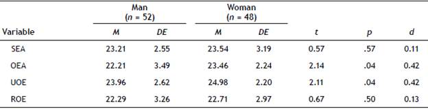 Regarding the differences in emotional intelligence factors according to participants' sex, statistically significant differences were found in Other's emotion appraisal (OEA) and Use of emotion (UOE). Both cases had a small effect size and were favourable for women (Table 3).