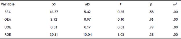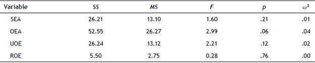 Reliability was measured using the alpha coefficient (a), and a value greater than .60 was considered as an acceptable level (Nunnally & Bernstein, 1994) during the first stages of a research. In this study, the data collected for the measured variables showed poor (UOE = .59), questionable (SEA = .68; OEA = .66) and good (ROE = .82) internal consistency reliability according to George and Mallery (2013).