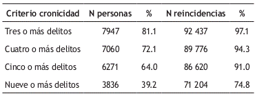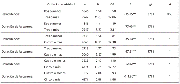 En la Tabla 4 se aprecia que, independientemente del criterio utilizado para definir la cronicidad, cuanto mayor es el criterio, resulta ser significativamente mayor (tamaño del efecto grande) el promedio de reincidencias y la duración de la carrera.