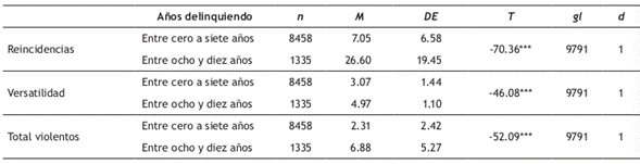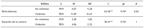 La duración de las carreras criminales del grupo de reincidentes se extiende entre uno y diez años (M = 4.2; DE = 2.6). Un 10.8% habría reincidido el mismo año del delito índice (2007), un 48.9% entre el primer y el cuarto año, y un 44.4% más allá del quinto año de su primera detención. Con el fin de verificar si el tipo de delito influye en el número de reincidencias y en la duración de las carreras, se procedió a realizar la comparación entre grupos (con y sin delitos violentos), apreciándose en la Tabla 3 que quienes han participado en delitos violentos alcanzan un promedio estadísticamente mayor que los que no han participado en ese tipo de delito, tanto en el número de reincidencias como en la duración de las carreras criminales, con un tamaño del efecto moderado y grande, respectivamente.