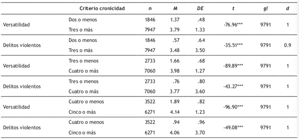 En la Tabla 5, al igual como ocurre con la reincidencia y la duración de la carrera, independientemente del criterio utilizado para definir la cronicidad, cuanto mayor es el criterio, el promedio de versatilidad y la participación en delitos violentos resulta ser significativamente mayor (tamaño del efecto grande).