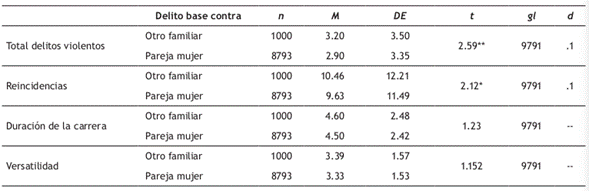 Con el fin de conocer la relación que pudiera existir entre el delito base y la trayectoria criminal futura, en la Tabla 6 se muestra que aquellos hombres detenidos en el 2007 por delitos VD contra otro familiar alcanzan promedios significativamente mayores en el total de los delitos violentos y el total de reincidencias (tamaño del efecto pequeño), con relación a los detenidos por VD contra pareja mujer, de manera que no existen diferencias en cuanto a duración de la carrera ni versatilidad.