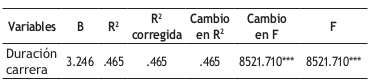 Con el fin de contrastar la capacidad predictiva de la duración de la carrera criminal sobre el número de reincidencias, se realizó un análisis de regresión múltiple, verificando en la Tabla 8 que la duración de la carrera criminal explica el 46.5% de la variabilidad de la reincidencia (R2 corregida = 0.465), a mayor duración de la carrera, mayor es la reincidencia ( B = 3.246).
