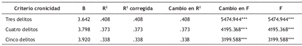 Para verificar si los criterios de cronicidad modifican la capacidad predictiva de la duración de las carreras criminales, en la Tabla 9 se aprecia que la mayor capacidad predictiva se presenta en el grupo de los crónicos identificados con base en tres delitos (R2 corregida = .408), de modo que disminuyen en los siguientes criterios.