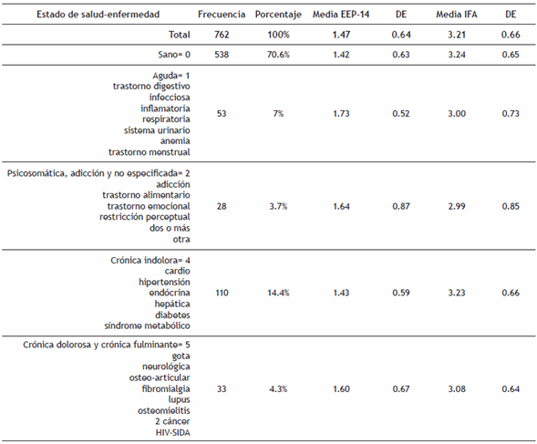 Con relación a la variable estado de salud-enfermedad, en los resultados del presente estudio se observó que el grupo con enfermedades crónicas (indoloras, no-fulminantes) tuvo una mayor prevalencia con relación al resto de los grupos por tipo de enfermedad, lo cual coincide con lo reportado a nivel mundial (OMS, 2016) y a nivel nacional (Inegi, 2018). Al comparar entre grupos la variable de estrés percibido solo se observaron diferencias significativas entre el grupo de personas sanas y el grupo de personas con enfermedades agudas, en particular en la subescala “sobrepasado por la situación”. Estos resultados sugieren que ante la presencia de una enfermedad aguda el nivel de estrés percibido será mayor, lo cual coincide parcialmente con lo encontrado por otros investigadores (Reed et al., 2016; Weekes et al., 2005). Una posible explicación para estos resultados podría ser que, como señalan Frankenhaeuser y Stokols, Novaco, Stokols y Campbell (como se citan en Taylor, 2007), cualquier situación amenazante en un principio producirá estrés, pero tal reacción se elimina con el paso del tiempo, es decir, la mayoría de las personas es capaz de adaptarse psicológicamente a algunos estresores. Dado que las enfermedades agudas tienen un comienzo súbito y una evolución rápida, esto podría generar en la persona la valoración de estar sobrepasada por la situación; en cambio, las enfermedades crónicas son de progresión lenta y de larga duración (OMS, 2019), lo cual permitiría a la persona asimilar los cambios derivados de la enfermedad y desplegar recursos para afrontar o adaptarse al proceso.
