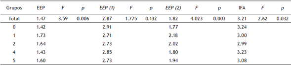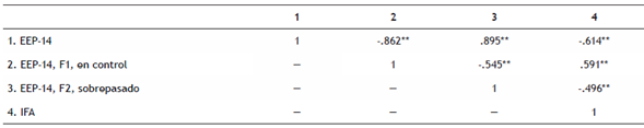 Respecto a la relación entre el estrés percibido y la felicidad, los resultados del análisis de correlación mostraron una relación negativa y estadísticamente significativa en la muestra (r = -.614, p < .01). En específico, el factor “en control de la situación” de la EEP-14 se correlacionó de forma positiva y estadísticamente significativa con la felicidad (r = .591, p < .01), mientras que el factor “sobrepasado por la situación” se correlacionó de forma negativa y estadísticamente significativa con la felicidad (r = -.496, p<.01). En la Tabla 2 se muestran los resultados del análisis de correlación.