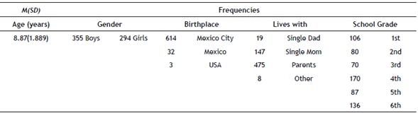 Participants included 649 children (Table 1). Using a simple random sampling method, participants were recruited from several public elementary schools in Mexico City. Participants were required to (1) reside within the selected school during the data collection period, and (2) consent to participate in the study. Participants with insufficient capacity to provide informed consent, insufficient proficiency in Spanish (spoken) to answer assessment questions, and a primary diagnosis of intellectual disability, head injury or substance misuse were excluded.