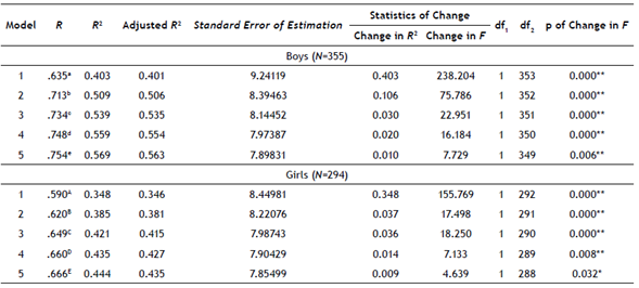 Concerning the findings obtained with Pearson’s correlation, in girls, assertiveness correlated positively with anxiety and some of its disorders, while negatively in boys. These results may be culturally explained by the fact that Mexican girls are raised in a limited environment with a lack of social, educational, labour, and recreational opportunities. Females are taught to be conservative and submissive, and not to engage in social interactions. Contrastingly, males are encouraged by society to compete, to take part in social activities and interactions, be independent and self-autonomous, and to accomplish goals. As such, unassertiveness is fostered in Mexican girls, while assertiveness is fostered in boys (González, Guevara, Jiménez & Alcázar, 2018). This may also help explain why assertiveness was not a significant predictor of SA in girls.