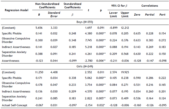To examine differences by gender when predicting SA, stepwise multiple regression analyses were carried out (Table 3). Regarding males, findings indicated that anxiety disorders, indirect assertiveness, and assertiveness explained 56.3% of the variance, F(5,349)=92.066, p<.001. With respect to females, results showed that the same anxiety disorders as with boys, indirect assertiveness, and actual self-concept explained 43.5% of the variance, F(5,288)=46.030, p<.001. Individual predictors were examined further and revealed that all of them significantly predicted SA for both genders (Table 4).