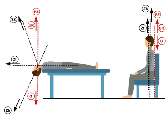 The gravity vector (G vector) follows the trajectory to the fall of a solid object in conditions of 1-g force (Mittelstaedt, 1983). There is an opposite direction relative to this vector, the so-called ‘vertical’ (Lopez et al., 2007). The point that defines the destination of the vertical vector is called physical zenith (PZ) (Mittelstaedt, 1983). Besides, there is a subjective visual vertical, which is the perceptual visual vertical (also percep tual upright), normally determined by visual cues, and also by the idiotropic tendency to perceive the visual vertical aligned with the body axis in a footward direction (Haji-Khamneh & Harris, 2010; Oman, 2003). The vector that points to the phys ical zenith (the up direction itself) is not always aligned with the subjective visual vertical, also called subjective zenith (SZ) (Mittelstaedt, 1983). When referring to the idiotropic vector (also known as Z body axis), what is implied is the direction of the components of the body considered as a whole (Lopez et al., 2008). Two different idiotropic axes have been recognized: the idiotropic axis of the trunk (Zt) and the one that refers to the head (Zh). These two axes are aligned when a person is perfectly upright; however, when the head is down, or when looking up while standing, the head idiotropic axis points in a different direction relative to the idiotropic axis of the trunk (Mittelstaedt, 1983). In brief, different vectorial magnitudes have been established, as can be seen in Figure 2.