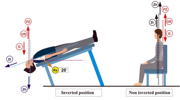 Participants were divided in two groups (see Figure 3): the first one had to carry out the task in a body position de fined by the alignment between the up-right direction (UR) and Zh axis (Z axis projected from head axis). This position was named non-inverted position (NIP). The second group performed the task in a body position that corresponded to a vectorial opposition between the up-right direction and Zh axis, where the Zt axis was at a rotation angle of 200 relative to the horizontal. This position was called inverted position (IP).