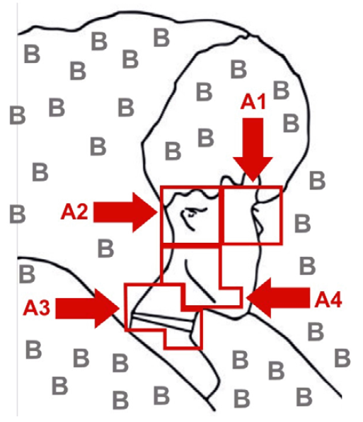 The areas of interest (AOIs) were codified as A1, A2, A3, A4, and “B” (Background), as can be seen in Figure 5. In order to assess audiovisual integration, it was necessary to count the number of visual percepts that were semantically congruent with each tone of voice. Based on the records, the perceptual reports were shown in a data table for each participant, indicating the area of interest on which their gaze was fixed 250 milliseconds before the recording of each report. This subtraction was made considering the time-dif ference that existed between each report and the moment in which the perceptual recognition was made, which in volved a complex reaction time (Bonnet, 1994). In order to establish relations between fixation areas and congruences and incongruences with the audio involved, analyses of as sociation were carried out between each of the AOIs and the congruent and incongruent visual percepts relative to each tone of voice used. All analyses were conducted using SPSS software (v.23) for Windows.