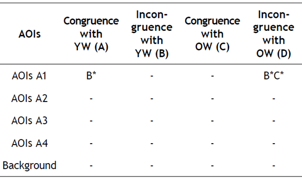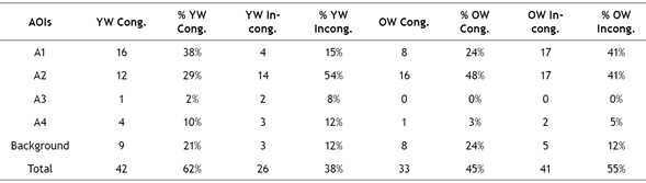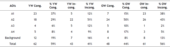 The ranked associations test (Table 2) shows how the fix ations in area A1 that were congruent with the YW percept were significantly different (p < .05) in comparison to when they corresponded to the incongruent percept. On the other hand, the association between the incongruence for the OW percept when observing the A1 area was significantly different when compared with the congruence for the OW percept, as well as when it was compared with the incon gruence with YW (regarding ocular fixations in the A1 area).