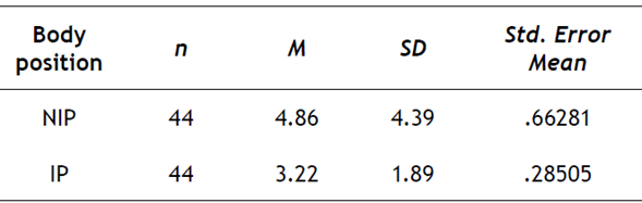 As shown in Table 4, there was a difference in the av erages of ocular fixations between groups NIP and IP. The result showed that in the position that refers to the vec torial alignment between the G and Zh axes, there was a greater quantity of ocular fixations in the areas of interest analysed with respect to those that occurred in the po sition corresponding to the vectorial opposition between the G and Zh axes. It was found that the NIP group had more ocular fixations in the areas of interest (M = 4.86; SD = 4.39) compared to the IP group (M = 3.22; SD = 1.89); t (86) = 2.268; p = .0002).