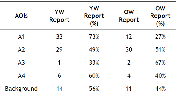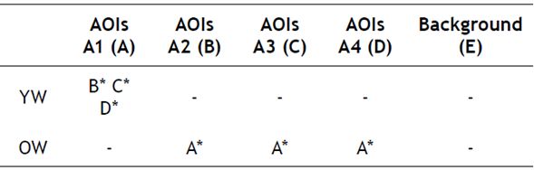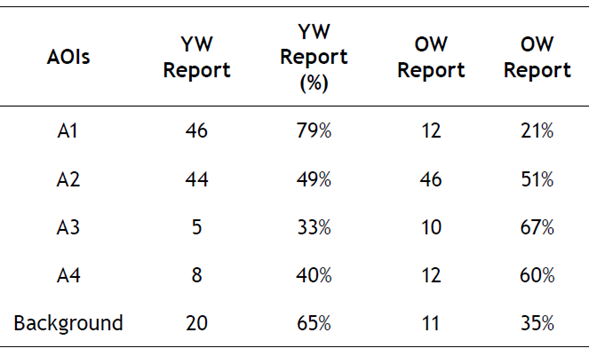 It was also found that the A1 area significantly favoured the YW percept compared to the other three areas (see Table 6). When reviewing the table of comparisons (Table 5), it is noted that the A1 area, with 79% of the fixations, corresponded to the YW report. As a matter of fact, there was a significant association between this area and the YW percept. Table 6 shows that there was significance (p < .05) when comparing the percentage value of fixations in A1 (with report YW) with the other percentage values for each of the other areas of interest that refer to the same YW report. Equally, when comparing ocular fixations in the areas A2, A3 and A4 (regarding OW percept) with fixations made in A1, the results showed that the first three areas were more associated with the OW percept compared with the A1 area.