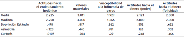 Se observa, en primer lugar, que las variables de estudio actitudes hacia el endeudamiento hedónico, valores materiales, susceptibilidad a la influencia de pares y actitudes hacia el dinero (poder y felicidad) presentan una baja dispersión de los datos (tabla 1). Junto con esto existe un bajo nivel de asimetría para todas las variables considerando un rango de 2 a -2 (Gravetter & Wallnau, 2014). Con respecto a las actitudes hacia el endeudamiento hedónico, los datos se concentran a la izquierda de la curva de distribución normal, caso contrario presentan las variables independientes. En el caso de la curtosis, se presentan tantos resultados positivos como negativos. Los datos negativos evidencian una curtosis platicúrtica, es decir, una baja concentración en los valores centrales, mientras los valores positivos denotan una curtosis leptocúrtica, es decir, los datos se concentran en los valores centrales de la variable.