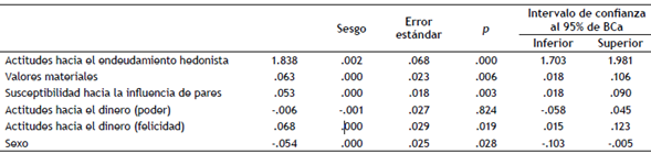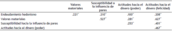Resultados: Se evidencian relaciones estadísticamente significativas entre sexo, valores materiales, susceptibilidad al efecto de pares y las actitudes hacia el dinero con respecto al endeudamiento hedónico.