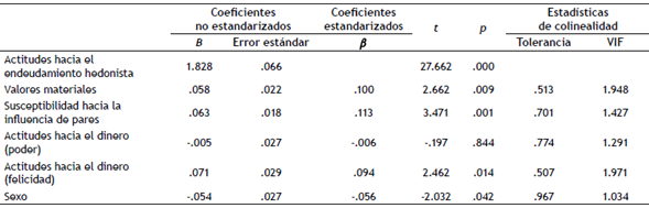 Finalmente, se observan los betas estandarizados, los cuales expresan una asociación estadísticamente significativa entre la variable dependiente y las actitudes hacia el dinero (felicidad), seguido por la susceptibilidad hacia la influencia de los pares, los valores materiales y el sexo vinculado al hombre (tablas 3 y 4).
