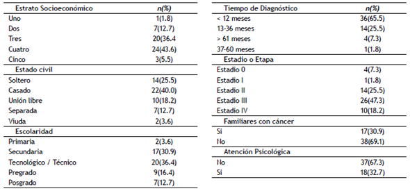 Se diseñó un estudio observacional transversal; con muestreo intencional participaron cincuenta y cinco mujeres, entre 27 y 69 años de edad (Medad = 42.3, DE = 10.1) diagnosticadas con cáncer ginecológico y en proceso de tratamiento. Son mujeres provenientes de las ciudades de Medellín (n = 38, 69.1%) y Santiago de Cali (n = 17, 30.9%), Colombia (véase tabla 1).