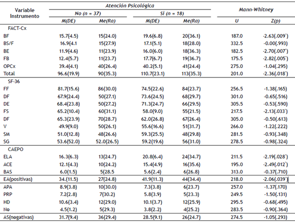 En el mismo sentido lo indicó el análisis inferencial no-paramétrico. Específicamente, en el FACT-Cx se hallaron diferencias en las siguientes dimensiones: BF (U = 187.0, Z = -2.63, p = .009, PS = .28), BE (U = 182.5, Z = -2.70, p = .007, PS = .27), FB (U = 175.5, Z = -2.82, p = .005, PS = .26), puntaje total del FACT-Cx (U = 182.5, Z = -2.70, p = .007, PS = .27). No se hallaron diferencias en BS/F y OPCx.