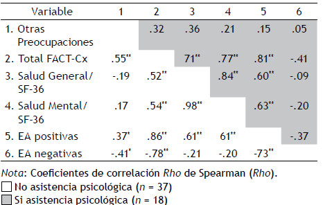 La matriz de correlaciones según la atención psicológica se observa en la tabla 3. En la diagonal inferior se muestran los coeficientes de correlación en el grupo de mujeres que reportaron no-asistencia. Los datos muestran que las EA positivas correlacionan con los puntajes de CvRS de OPCx (Rho = .37, p < .05), el total del FACT-Cx (Rho = .86, p < .01), Salud General y Salud Mental del SF-36 (Rho = 61, p < .01). En tanto que las EA negativas se correlacionan negativamente con OPCx, (Rho = -.41, p < .05), el total del FACT-Cx (Rho = -.78, p < .01). Salud General y Salud Mental del SF-36 no correlacionó.