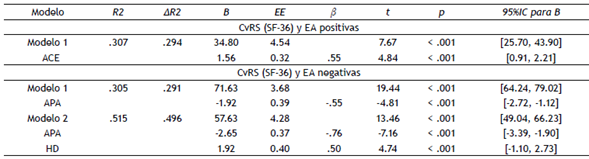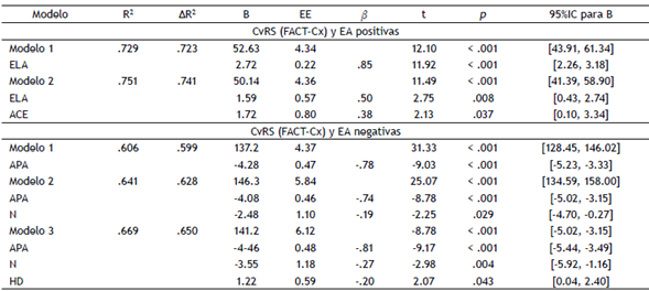 El modelo de regresión lineal múltiple indica que las EA positivas predicen la CvRS en el FACT-Cx (R2 = .75, ΔR2 = .74, F(2, 52) = 78.22, p < .001). El 75% de la varianza de la CvRS está explicado por las EA positivas (modelo 2, tabla 4): Enfrentamiento y Lucha Activa (β = .50, t = 2.75, p = .008, 95%IC (0.43, 2.74)) y Autocontrol y Control Emocional (β = .38, t = 2.13, p = .037, 95%IC (0.43, 2.74)). La dimensión Búsqueda de Apoyo Social no fue incluida por el método de paso a paso del modelo. Similarmente, las EA negativas predicen negativamente la CvRS (R2 = .67, ΔR2 = .65, F(3, 51) = 34.41, p < .001), el 67% de la varianza es explicada por las dimensiones de Ansiedad y Preocupación Ansiosa (β = -.81, t = -9.17, p < .001, 95%IC(-5.44, -3.49)), Negación (β = -.27, t = -2.98, p = .004, 95%IC(-5.92, -1.16)), y Huida y Distanciamiento (β = -.27, t = -2.98, p = .004, 95%IC(-5.92, -1.16)).