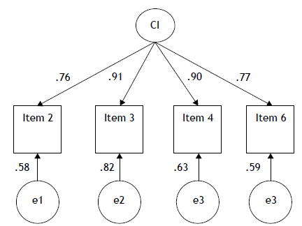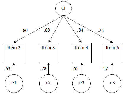 Os resultados da AFE indicaram que a escala 4-IC é fatorável (Teste de esfericidade de Bartlett = 565.9, gl = 6; p < .001; KMO = .795). O método de extração de fatores recomendou para uma escala unifatorial como sendo a mais adequada, explicando 81.9% da variância total (Tabela 2) com valor do coeficiente Ômega de .93. Mais uma vez, a Análise Paralela corroborou a estrutura unidimensional para a escala (Variância dos dados reais, Fator 1: 89.26%, Fator 2: 10.73%; Variância dos dados aleatórios, Fator 1: 66.63%, Fator 2: 32.69%). Dessa forma, constata-se a semelhança dos resultados obtidos no Estudo 1 e na Subamostra 1 do Estudo 2. Novamente, os índices de ajuste e de resíduo se demonstraram satisfatórios c² = 7.83; gl = 2; p < .01; RMSEA (95% IC) = .113 (.000 - .236); CFI = .997; TLI = 990, com exceção do RMSEA.