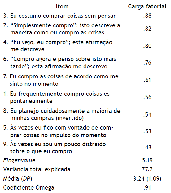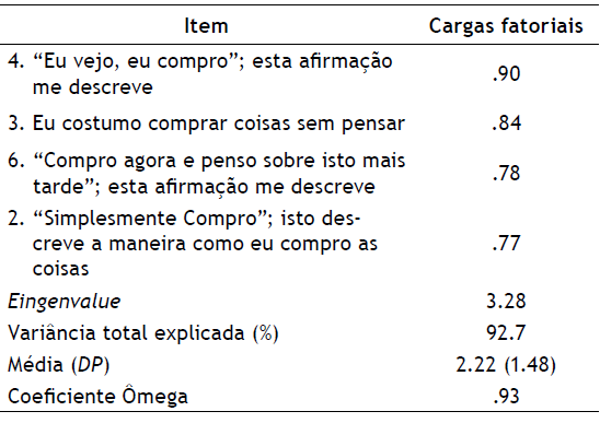 No presente estudo, a escala trabalhada foi a de Padilha et al. (2015). Essa escala é a versão brasileira da escala de compra por impulso de Rook e Fisher (1995). A escala inicialmente construída é composta por nove itens com cargas fatoriais que variam de .60 a .81 e valor alfa de .88 (Rook & Fisher, 1995). Estudos relacionados à compra por impulso têm sido realizados em diferentes contextos (e.g., Vietnã, Turquia, Suécia, Reino Unido, Paquistão, etc.) demonstrando adequados índices psicométricos dessa escala (Ahmad et al., 2019; Cakanlar & Nguyen, 2019; Spiteri Cornish, 2020). No Brasil, Padilha et al., (2015) realizaram um estudo de adaptação da escala que apresentou alfa de Cronbach adequado (𝛼 = .87) com 51.2% de variância explicada e, posteriormente, Aquino et al. (2020) apresentaram novas evidências de validade para o mesmo instrumento.