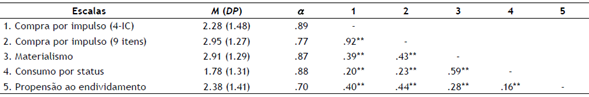 A Tabela 3 apresenta as médias, desvios-padrão e correlação de todas as escalas utilizadas. O teste de diferença de correlação Z de Fisher permitiu identificar que as duas escalas de compra por impulso não possuem correlações significativamente diferentes com a escala de materialismo Teste Z de Fisher, z = -1.163; p = 0.122, q = .048, consumo por status Teste Z de Fisher, z = -0.761; p = 0.223, q = .031 e propensão ao endividamento Teste Z de Fisher, z = -1.175; p = 0.12, q = .049. Isso indica que a escala reduzida (4-CI) mantém suas propriedades de mensuração similares à escala original sem perdas substanciais de informação.