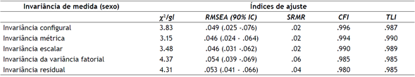 Conforme pode ser visto na Tabela 4, a 4-CI apresenta invariância de medida para todos os modelos testados, de modo que a medida é considerada completamente equivalente para homens e mulheres.