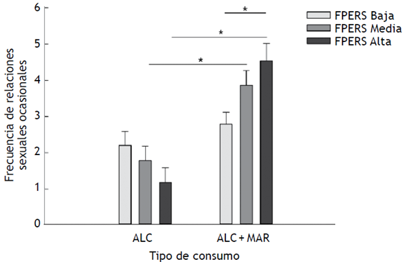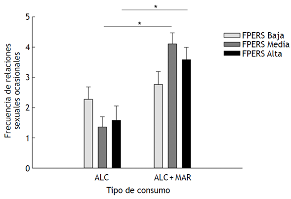 El tipo de consumo se asoció significativamente con el promedio de parejas sexuales por año (F(1, 452) = 14.46; p < .001; ŋ2p = .03), al presentar ALC+MAR mayor promedio que ALC. No se observaron resultados significativos de las dimensiones de impulsividad.