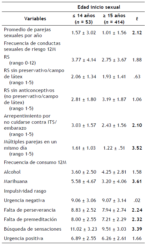 Quienes reportaron inicio sexual temprano exhibieron un promedio de parejas sexuales por año y una frecuencia de arrepentimiento por no cuidarse contra ITS/embarazo significativamente mayor que quienes se iniciaron más tarde. Específicamente, quienes se iniciaron tempranamente exhibieron una media de frecuencia de arrepentimientocorrespondiente a la categoría “la mitad de las veces” (M = 3), y quienes se iniciaron más tarde exhibieron una media equivalente a la categoría “a veces” (M = 2). Asimismo, los resultados mostraron una diferencia significativa entre ambos grupos para la frecuencia de múltiples parejas. Sin embargo, ambos grupos exhibieron un puntaje medio correspondiente a la categoría “nunca/casi nunca” (M = 1). Es decir, esta conducta fue poco frecuente más allá de la edad de inicio sexual. Finalmente, el grupo con inicio sexual temprano exhibió una frecuencia de consumo de marihuana en el último año y un nivel de falta de perseverancia, falta de premeditación y búsqueda de sensaciones significativamente mayores que quienes no tuvieron inicio temprano (Tabla 1).