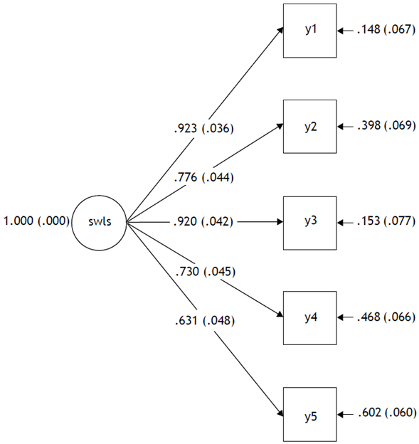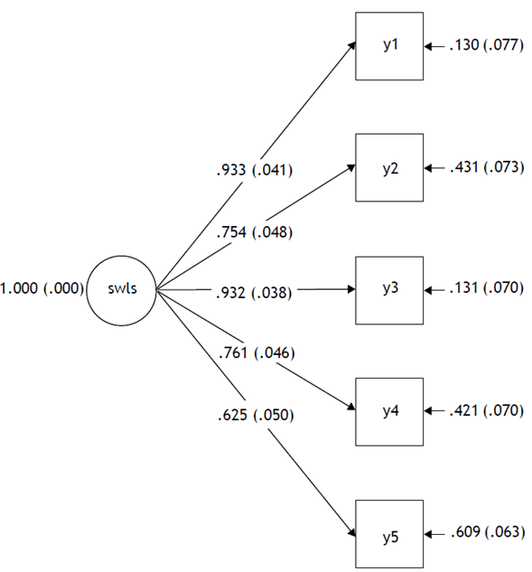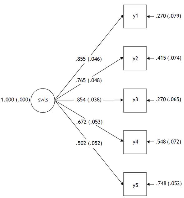 Subjective well-being (SWB, Diener & Biswas-Diener, 2000) is a person’s assessment of their own life, which involves an emotional component, encompassed by the construct of happiness (Arita, 2005), and a cognitive component, satisfaction with life (Diener et al., 1985). Different cultures hold different meanings regarding what encompasses well-being and a good life. The Satisfaction with Life Scale (SWLS; Diener et al., 1985) is one of the most widely used scales to globally measure the cognitive component of SWB (Atienza et al., 2016; Dimitrova & Dominguez, 2015; Oishi, 2006; Sovet et al., 2016; Tomás et al., 2015; Whisman & Judd, 2016). Given its extensive use across different cultures and populations, researchers using the SWLS need to ensure that the psychometric equivalence of this construct holds up across groups or across time (Huang et al., 2011). The assessment of this equivalence is termed measurement invariance, a key analysis in both psychological and developmental research because it is a prerequisite for comparing group means (Huang et al., 2011; Jang et al., 2017; Putnick & Bornstein, 2016). Cultural differences in interpreting satisfaction with life can result in nonequivalence of measures, or measurement noninvariance (Jang et al., 2017).