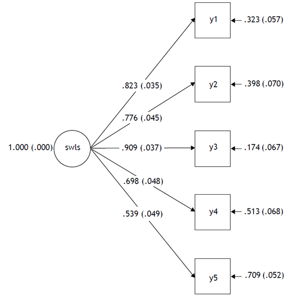 The SB x2 difference t est between configural invariance (Model 0) and metric invariance (Model 1) models was not significant, demonstrating support for metric invariance. Therefore, the factor loadings were invariant among university students from both countries. Thus, each item on the SWLS contributes in a similar degree to the latent variable among the university student samples from these two countries.
