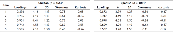 The standardised factor loadings and descriptive statistics and goodness-of-fit indices of both the Chilean and Spanish samples are displayed on Table 1. The CFA from both countries showed fit indices which provide support for a one-dimensional factor structure and reliability. Although the x2 test was significant, it is well established that the x2 test is sensitive to sample size (MacCallum et al., 2006).