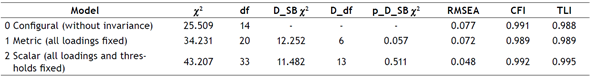 Different outcomes were considered for the analysis. To test the invariance of the factor model in the samples according to the country and gender, configural invariance, metric invariance and scalar invariance were verified (Dimitrov, 2010). To determine model fit of the data of the one-dimensional factor structure of the SWLS, and to determine the achievement of configural invariance, model Chi-square (x2), Comparative Fit Index (CFI), Tucker-Lewis Index (TLI), and Root Mean Square Error of Approximation (RMSEA) were used. Criteria for good model fit were nonsignificant model Chi-square, CFI > 0.96, TLI > 0.95, and RMSEA < 0.06 (Hu & Bentler, 1999). Model fit was considered acceptable when CFI > 0.90, TLI > 0.90, and RMSEA < 0.08 (Marsh et al., 2004). Lastly, to establish the achievement of metric and scalar invariance, a nonsignificant Delta of Satorra-Bentler Chi-square adjustment (D_SB x2) was required (Satorra & Bentler, 2001).