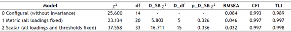 Consequently, factor loadings were constrained to be equal throughout groups to test for metric invariance (Table 2).