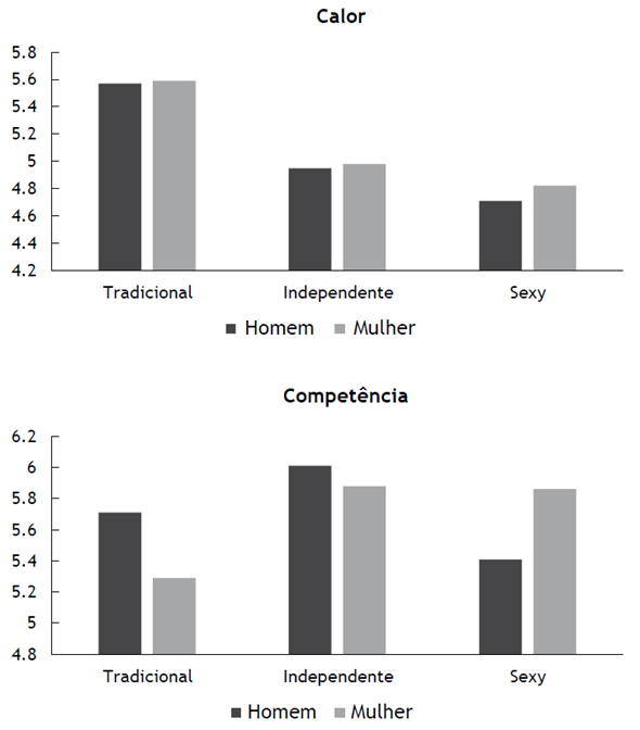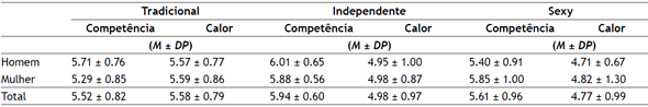 Calor e competência. Como se pode observar pela Tabela 4, maiores avaliações de calor correspondem à mulher tradicional (Mtrad = 5.58; DP = .79), enquanto maiores avaliações de competência são dadas à mulher independente (MInd = 5.94; DP=.60).