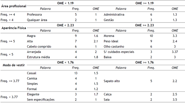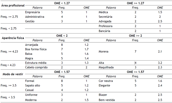 Área profissional, aparência física e modo de vestir. Para análise do conteúdo das respostas abertas relativas à área profissional, aparência física e modo de vestir de cada tipo de mulher representado neste estudo, optou-se pela utilização da análise prototípica de Vergès (1992). Os participantes responderam de forma esporádica, apresentando características soltas, articuladas na forma de palavras ou expressões, que favorece uma análise prototípica. Tal como uma análise de conteúdo, esta análise mede a frequência das palavras e acrescenta ainda a ordem pela qual estas foram evocadas. Esta análise é conhecida pela sua eficácia mesmo em amostras pequenas e dados pouco estruturados (Wolter et al., 2009).