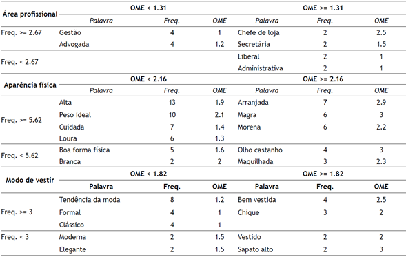 Mulher sexy. Os elementos mais frequentemente evocados na avaliação da mulher sexy são “gestão”, “advogada”, “chefe de loja” e “secretária”, de aparência física “alta”, “peso ideal”, “cuidada”, “loura”, “arranjada”, “magra” e “morena”, com modo de vestir “tendência da moda”, “formal”, “clássico”, “bem vestida” e “chique” (Tabela 3).