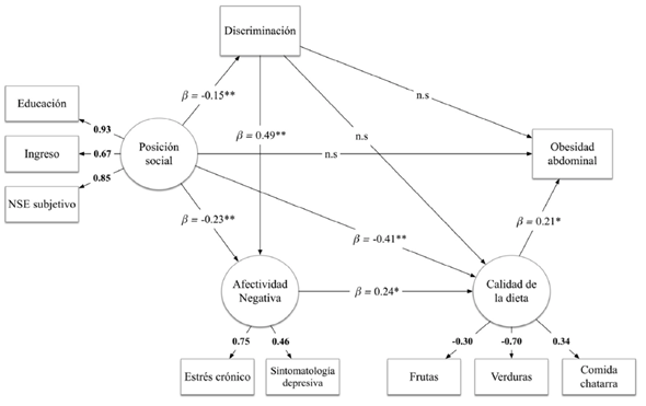 Resultados: análisis de ecuaciones estructurales revelaron que la posición social no se asoció directamente con obesidad abdominal, pero sí a través de una secuencia de mediación que incluyó la percepción de discriminación, afectividad negativa y calidad de la dieta. El apoyo social no moderó estas relaciones.