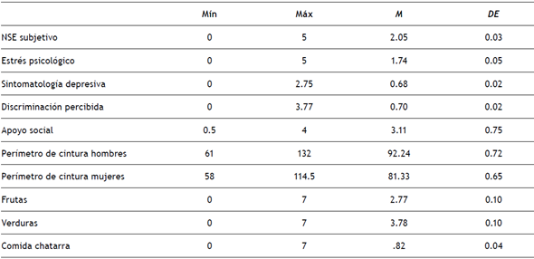 El 23 % de los participantes terminó bachillerato/preparatoria, 22 % una carrera técnica, 19 % reportó grado de magíster y el restante 36 % grado académico de doctor o equivalente. Un 12 % indicó tener un ingreso mensual individual igual o menor a USD 316, 60 % un ingreso entre USD 316 y USD 1265 y 28 % un sueldo mayor a USD 1265. Un 24.19 % de las participantes tuvo un perímetro de cintura > 88 cm. En el caso de los hombres, un 13.37 % tuvo un perímetro de cintura > 102 cm. En la Tabla 1 se reportan las características descriptivas de las variables psicológicas y conductuales del estudio.