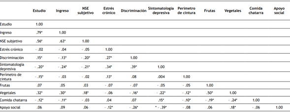En el modelo general propuesto (véase Figura 1) se contemplaron tres factores latentes, el primero para PS (compuesto por los indicadores de educación, ingreso y NSE subjetivo), el segundo para afectividad negativa (compuesto por los indicadores de estrés crónico y sintomatología depresiva) y el tercero para calidad de la dieta (compuesto por los indicadores de consumo de frutas, verduras y comida chatarra). En el análisis de ecuaciones estructurales ejecutado se obtuvieron cargas factoriales significativas (p > .05) y en rangos de .30 a .93 para los indicadores de los factores latentes antes señalados.
