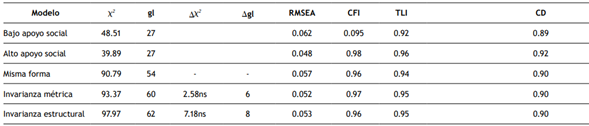 Por último, para determinar si el apoyo social moderó el patrón de relaciones propuesto, se llevó a cabo un análisis de ecuaciones estructurales de multigrupo, siguiendo las recomendaciones de Byrne (2008). Para tal efecto, la variable apoyo social fue dicotomizada por la mediana, generando un grupo de alto y otro de bajo apoyo social.