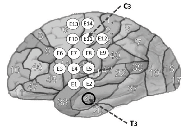 The placement of the electrodes was done according to the neurological models on language by: Geschwind (1965) and Poeppel and Hickok (2004). To reference the neuroheadset on each subject’s head, the T3 and C3 positions were used according to the 10-20 system (Figure 1). Finally, a light source was placed at a distance of one meter from the person to signal the time to begin the task of thinking of a specific vowel with silent speech, and also, to end the activity. During the experimental phase, persons were asked to keep their eyes closed to reduce artifacts, such as blinking and eye movement, while developing the task.