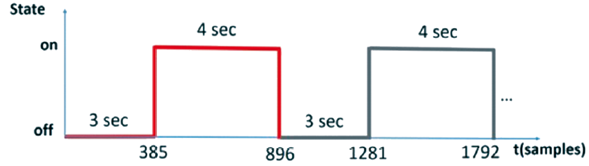 Each person was told that as long as the light source was turned on, they were to think about the corresponding vowel continuously and with silent speech. They were also told that when the light source was turned off, they had to stop thinking about said vowel and go into a state of bodily relaxation. During the experiment, the light source was kept activated for four seconds and then, it was turned off for three seconds. The procedure was repeated 25 times for each of the two vowels. Between each silent speech task, the subjects rested for 5 minutes before proceeding to the next vowel change. The vowels were arranged in the following order: first /a/; and second /u/. Although some authors suggest that data collection in EEG signals should be taken randomly (Li et al., 2018), other researchers suggest performing the data collection of vowels or syllables with EEG signals in an orderly and deterministic way (Cooney et al., 2020; Pressel Coretto et al., 2017). The sampling intervals in silent speech were (385-896, 1281-1792, ...) (Figure 2).