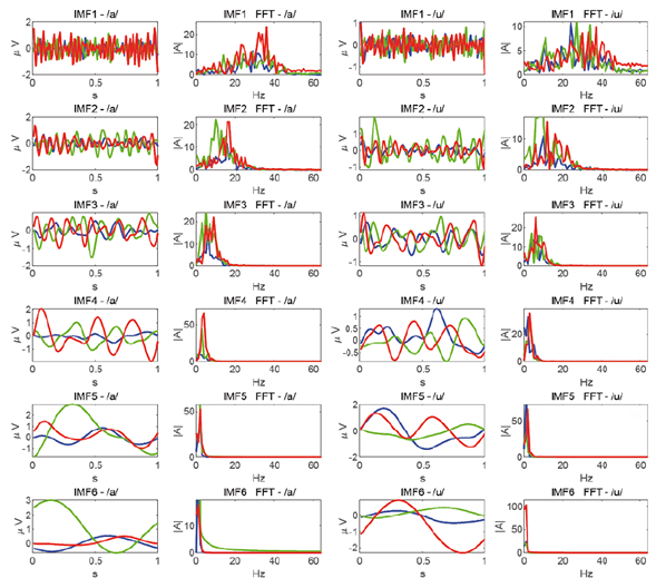 Based on the above equation, S is the person, v is the vowel, p is the electrode, A is the width of the window, IMF is the multivariate function resulting from the APIT-MEMD, m is an IMF level, and n are the samples to be analysed. In this case, the number of IMFs analysed was 10 (Figure 3).